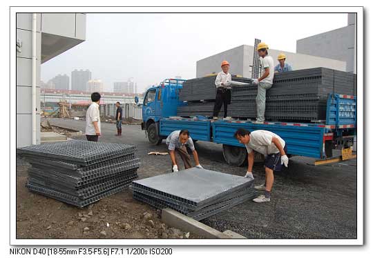 資料圖片:100噸江陰產(chǎn)潤霖模塑玻璃鋼格柵被運往上海世博會施工現(xiàn)場
